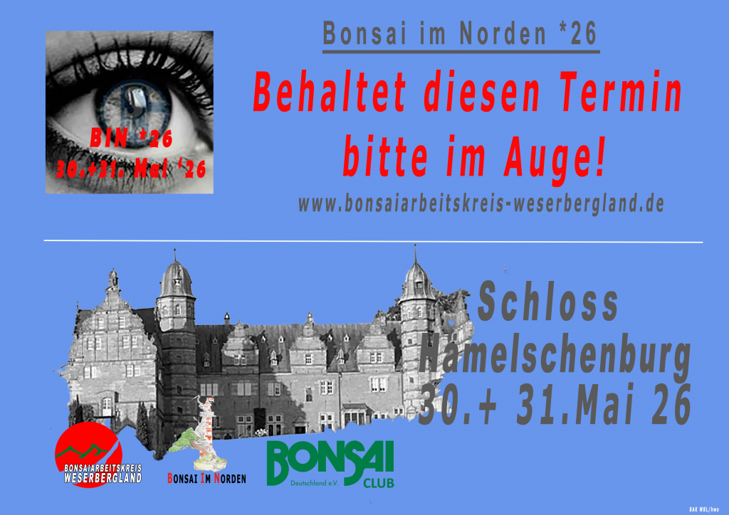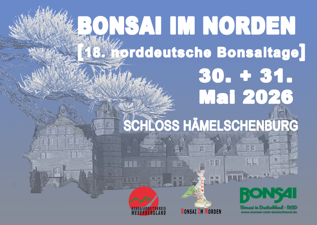 BIN ’26 – auf Schloss Hämelschenburg 30.+31.Mai ’26 Veröffentlicht am 29. Oktober 20259. November 2025 von Bonsaihermi Verschlagwortet mit Ausstellung, Bonsaiarbeitskreis Weserbergland, Events mit dem Bonsaiarbeitskreis Weserbergland … mehr unter Events demnächst!